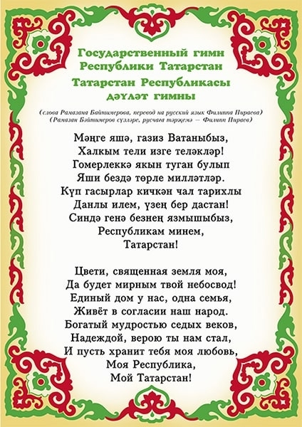 20 лет гимн республики исполнялся без слов. В 2013 г. был утверждён текст. Он состоит из восьми строк на татарском и восьми строк на русском языке. Автором перевода на русский язык стал Филипп Пираев.